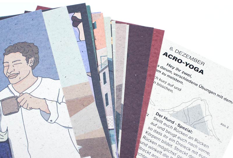 Die Adventskalender Box beinhaltet 24 bunt designte Graspapier-Karten mit unterschiedlichen (nicht sexuellen) Aufgaben, zwei Bleistifte, einen Block, einen Karten-Aufsteller aus Holz sowie eine Bio-Gewürzmischung für eine der Aufgaben.