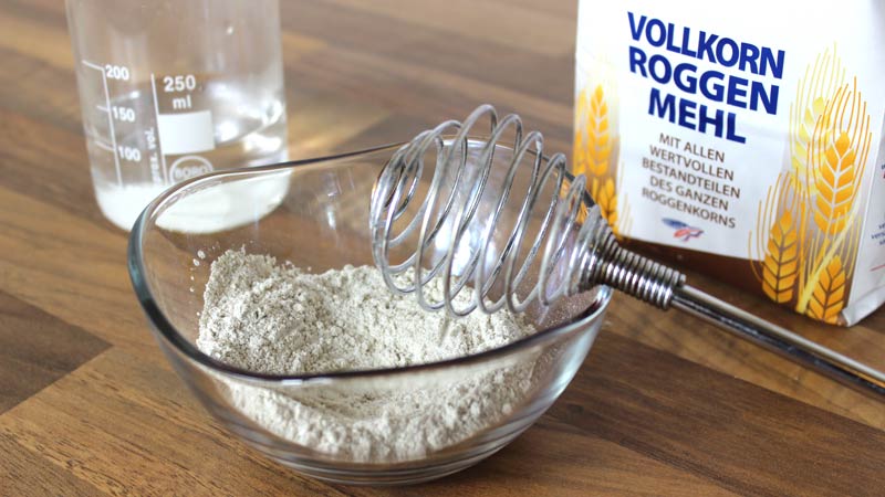 Außer einer Schüssel, einem Schneebesen (o.ä.), lauwarmen Wasser, einen Esslöffel und Roggenmehl benötigt ihr nichts. Für mein mittellanges Haar benutze ich meist 2 Esslöffel Roggenmehl und ca. 150 ml Wasser. Hier müsst ihr aber selbst ein wenig rum probieren. In jedem Fall sollte Eure Mischung nach ca. 5 – 10 Minuten klümpchenfrei sein.
