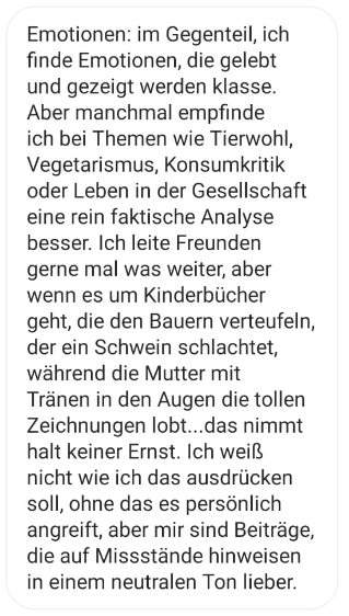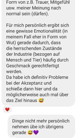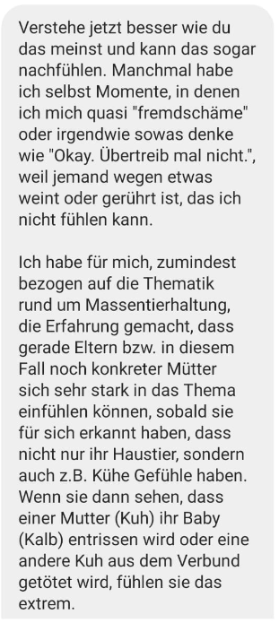 Wer diese Perspektive, aus welchen Gründen auch immer, nicht sehen kann, für den wird Mitgefühl mit (insbesondere) sogenannten „Nutztieren“ IMMER lächerlich und übertrieben bleiben. Schafft man es hingegen, eröffnen sich neue (Handlungs-)Perspektiven und Möglichkeiten zum Austausch.