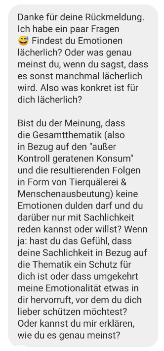 Auf Instagram startete ich am Freitag eine Fragerunde. Konkret ging es mir einerseits darum herauszufinden, was Menschen genau von mir erwarten, wenn sie sagen „Man sollte respektieren, dass Menschen Fleisch essen!“, zum anderen wollte ich herausfinden, ob die Menschen, die sich durch meine Themen angegriffen fühlen, eine Mehrheit oder Minderheit bilden. Und ich wollte zur Reflexion anregen. All das ist mir auch gelungen.