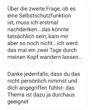 Unseren Austausch könnt ihr in der Bildergalerie nachlesen (Anklicken zum Vergrößern, oben links fängt die Unterhaltung an).