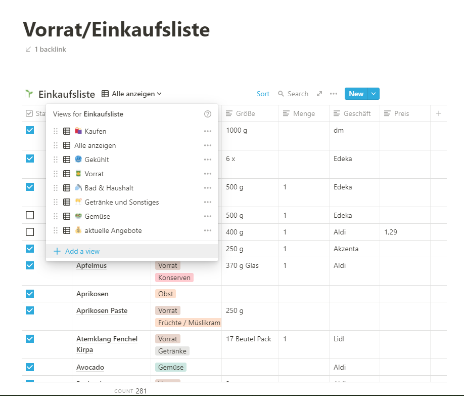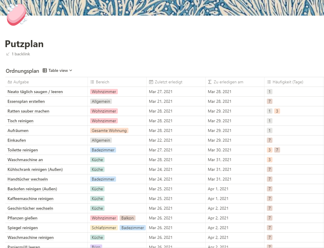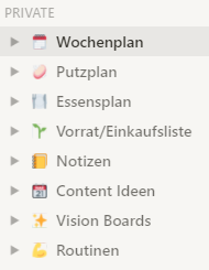 Notion ist (augenscheinlich) GENAU DAS, nachdem ich gesucht habe. Diese Woche habe ich quasi jede freie Sekunde genutzt, um meine Notion einzurichten. Ich habe beispielsweise eine Vorratsliste angelegt, die gleichzeitig beinah automatisch eine Einkaufsliste für mich erstellt. Ich habe einen Putz- bzw. Ordnungsplan, der mir auf einen Blick zeigt, was gerade / in der Zukunft ansteht und wann ich Aufgaben zuletzt erledigt habe. Es gibt einen Platz für meine Notizen, für Ideen, Visionen, Routinen und meinen Essensplan. Mein Wochenplan vereint alle Tools übersichtlich, zeigt mir aktuelle Aufgaben und künftige Pläne an und hat unten noch einen kleinen Bereich zur Wochenreflexion.