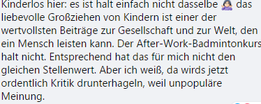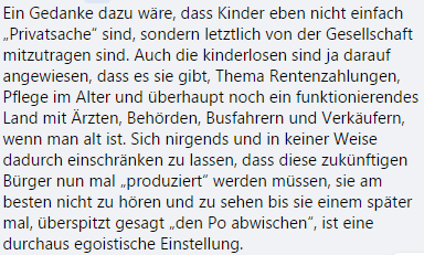 Dennoch haben mich manche der Ansichten und Gedanken in den Diskussionen doch nochmal sprachlos gemacht. Eine der populärsten Meinungen in diesen Diskussionen: Kinder kriegen ist keine Privatsache, sondern ein Dienst für die Gesellschaft. Kinderlose sollen sich da mal nicht so anstellen, die haben ja schließlich ein laues Leben und geben der Gesellschaft nichts.