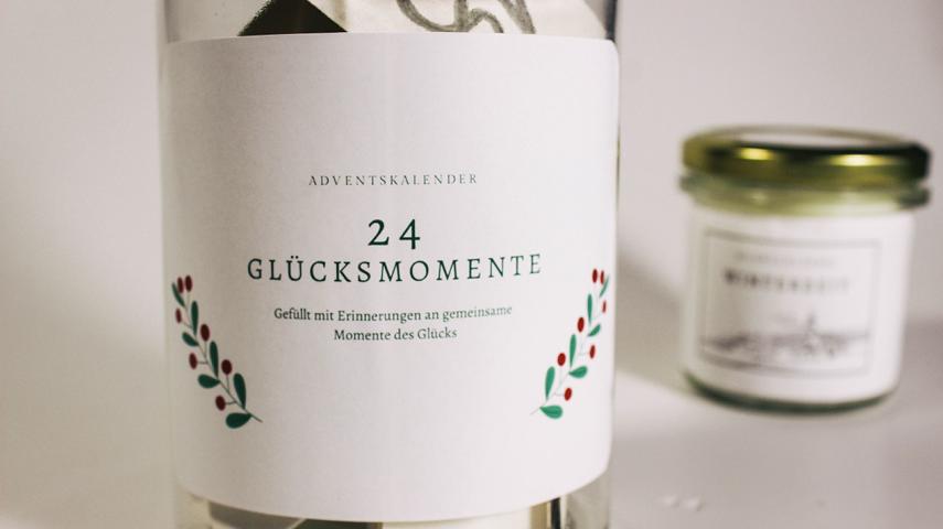 Dazu werden 24 Erinnerungen an Glücksmomente mit der beschenkten Person auf nummerierte Zettel geschrieben. Die Zettel werden dann gefaltet und in ein Konservenglas gegeben. Ein individueller Aufkleber* (abgerundetes Rechteck, 10,2 x 7,6 cm) verschönert das Glas. Hier könnt ihr euch meine Vorlage herunterladen.