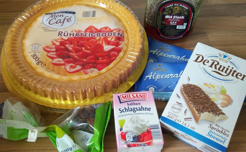 Ich hab es allerdings „jugendfrei“ gemacht mit 2 Fläschchen Rumaroma, ohne Rosinen und mit selbstgebackenem Tortenboden.