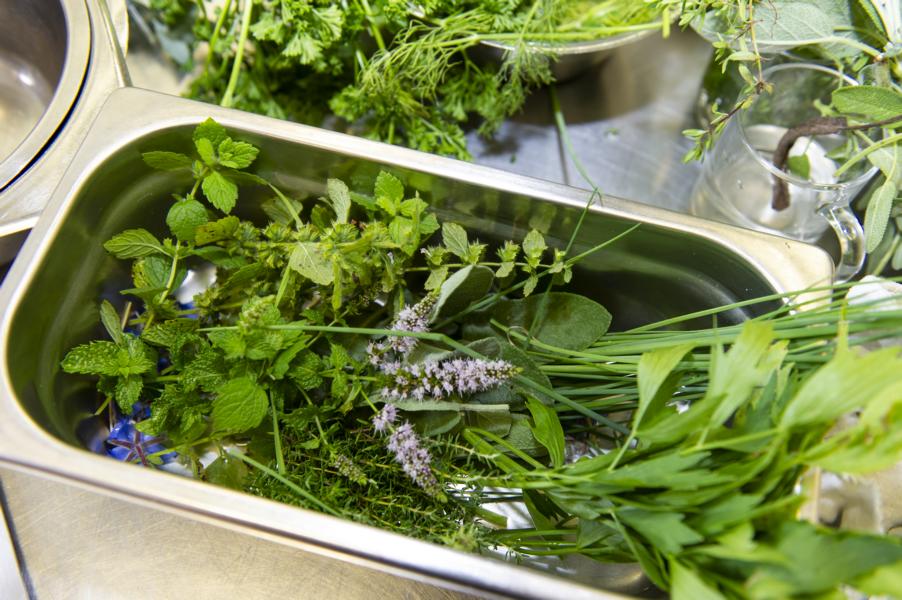 Im Rahmen der Bloggerreise kochten meine KollegINNen Thorsten, Hubert und Maria, nachdem wir uns im wunderschönen Klostergarten gegenüber die passende Kräuter-Begleitung besorgt hatten, die Speisen des Wildkochkurses.